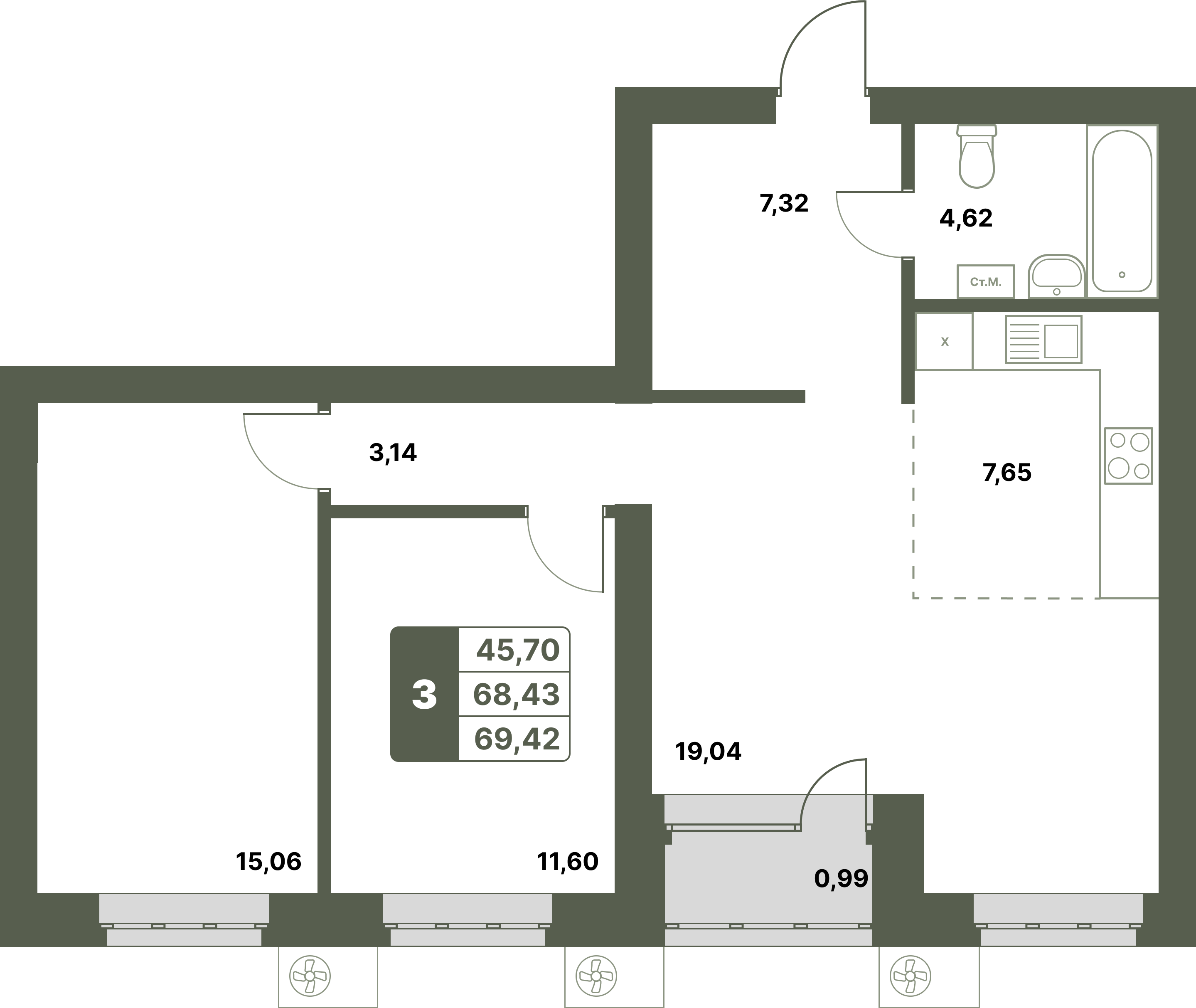 Трехкомнатная квартира в новостройке 69,42 м2 по ул. Лётчиков 1/9 за 7983300 руб. |